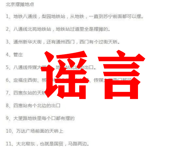 近日,网传北京发布“地摊地图”,经记者向市城管委核实,此为谣言。“地摊地图”中所谓的109处摆摊地点,实际上是多年前本市无序设摊较为集中的点位。经过近年来的综合整治,这些摊点基本得到整治。
