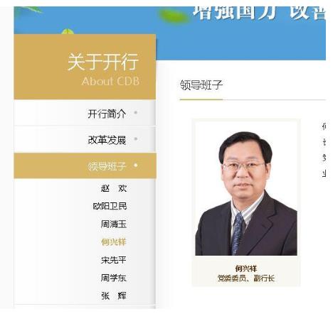 据国家开发银行官网显示,何兴祥被查前,国开行除董事长赵欢、行长欧阳卫民外,还有四名副行长,何兴祥在四名副行长中排名第二。目前,国家开发银行官网上,在何兴祥出席的相关活动中,已看不到他的名字。