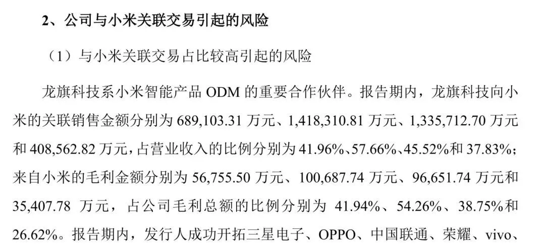根据2017年提交的《招股书》,2016-2017上半年,龙旗科技与小米的关联交易分别为2.94亿元、4.25亿元,分别占龙旗科技当年总收入的3.53%和12.2%。
