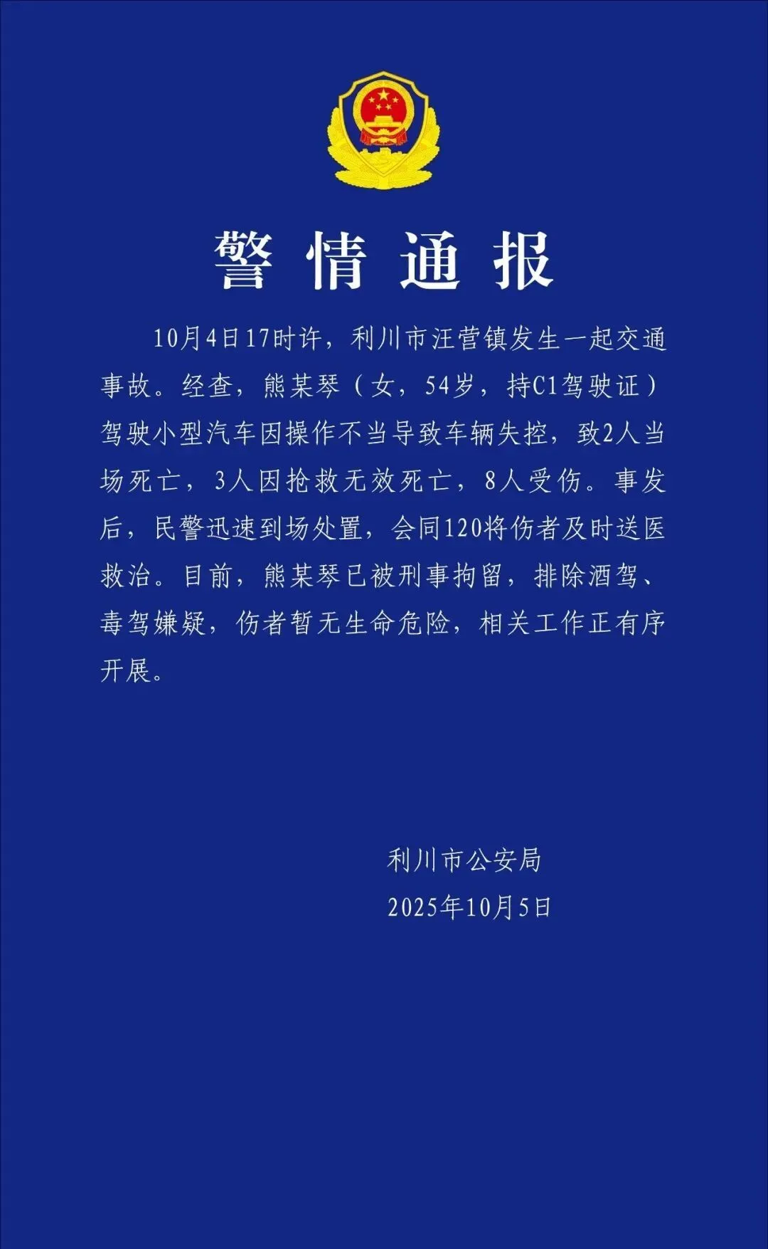 10月4日17时许,利川市汪营镇发生一起交通事故。经查,熊某琴(女,54岁,持C1驾驶证)驾驶小型汽车因操作不当导致车辆失控,致2人当场死亡,3人因抢救无效死亡,8人受伤。