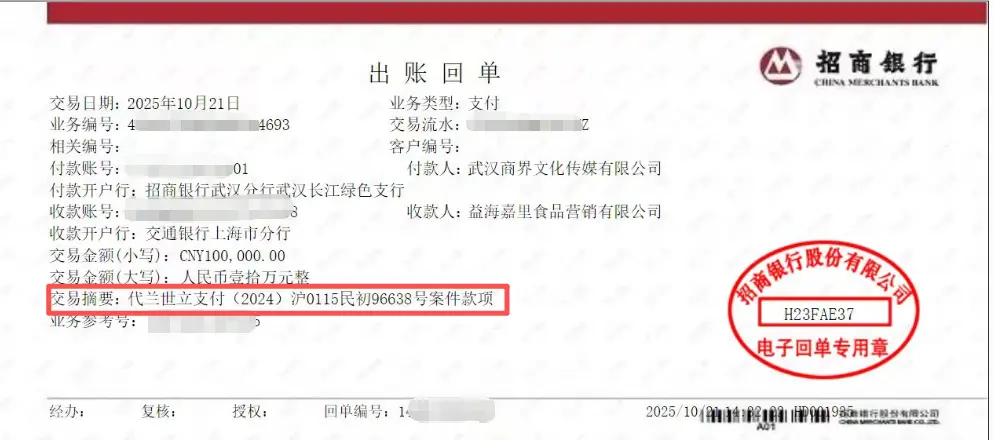 根据兰世立所提供的出账回单显示,付款人武汉商界文化传媒有限公司向益海嘉里食品营销有限公司支付了10万元,并备注“代兰世立支付(2024)沪0115民初96638号案件款项”。
