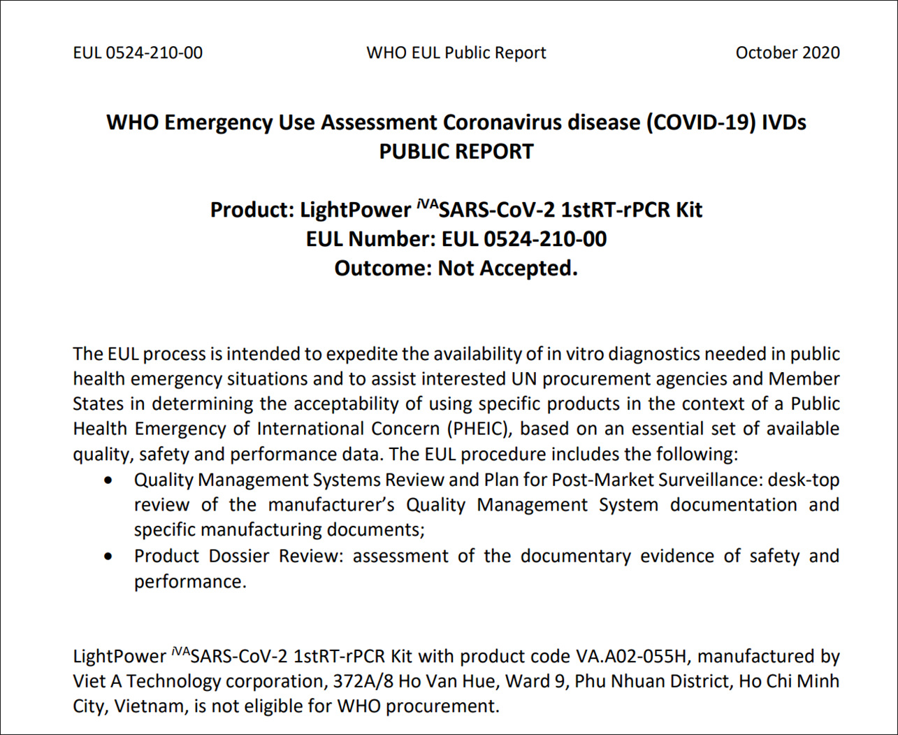 世卫组织2020年10月的一份报告明确指出,Viet A试剂盒并不符合世卫组织的采购资格。直到2022年4月世卫组织“不获EUL接受的产品”清单中,Viet A试剂盒仍榜上有名,理由是有关申请“未能满足安全性、性能和/或质量管理体系(QMS)所需的文件证明”。