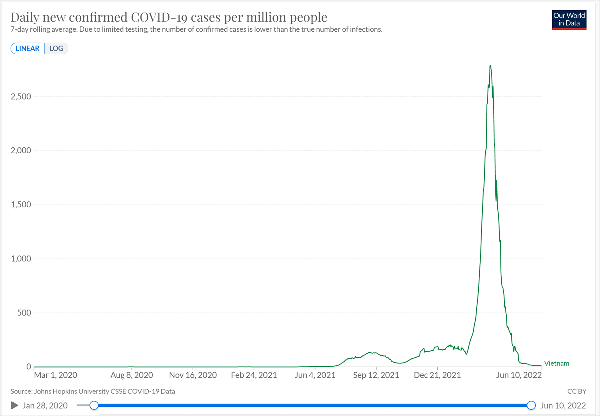 随着新冠变种病毒不断出现,越南这个“抗疫优等生”风光不再。经历了2021年下半年的疫情,越南的疫情曲线从2022年2月开始急剧上升,至3月中旬达到峰值,单日确诊人数一度突破20万例,随后开始下降。