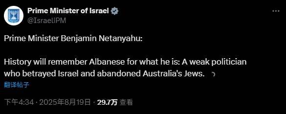 8月19日,以色列总理办公室在官方X账号发布声明。以总理内塔尼亚胡在声明中称:“历史会记住澳大利亚总理阿尔巴尼斯的真面目——一个背叛以色列、抛弃澳大利亚犹太人的软弱政客。”