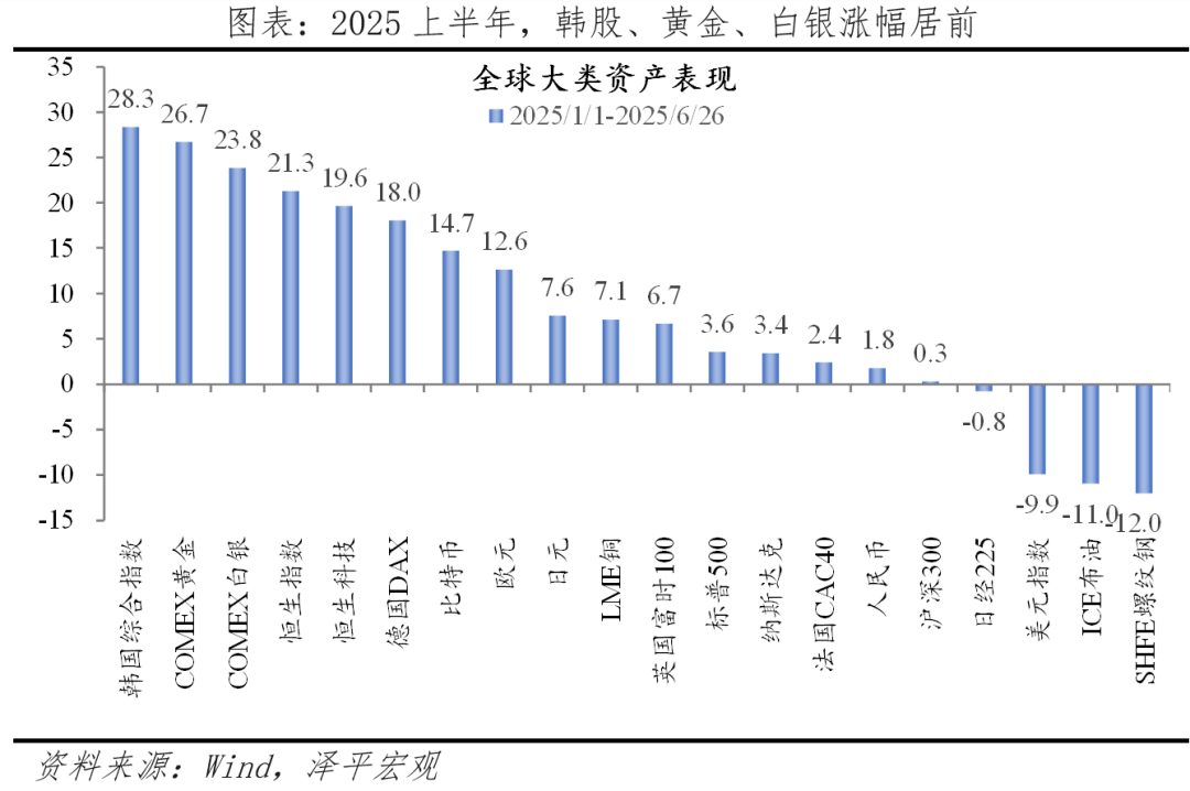 2025年上半年,非美市场股票、贵金属涨幅明显。2025年初至6月26日,涨幅居前的大类资产前5位是韩国综指28.34%、COMEX黄金26.71%、COMEX白银23.85%、恒生指数21.26%、恒生科技19.63%。贵金属涨幅受益于“去美元化”、避险情绪升温;韩国、香港、德国股指表现亮眼,年初美股回调,资本从美国外溢至其他市场找寻亮点。美元指数、原油、螺纹钢居后,涨幅-9.9%、-11%、-12%。