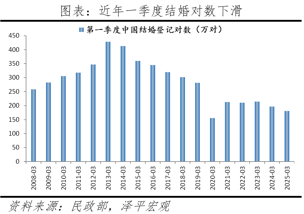 3)不婚化加剧。由于“无春年”、年轻人口减少、结婚成本过高、婚姻观念改变等,2024年全国结婚登记610.6万对,较2023年减少157.6万对,降幅为20.5%。2025年第一季度全国结婚登记同比为-8.1%,再创同季新低。