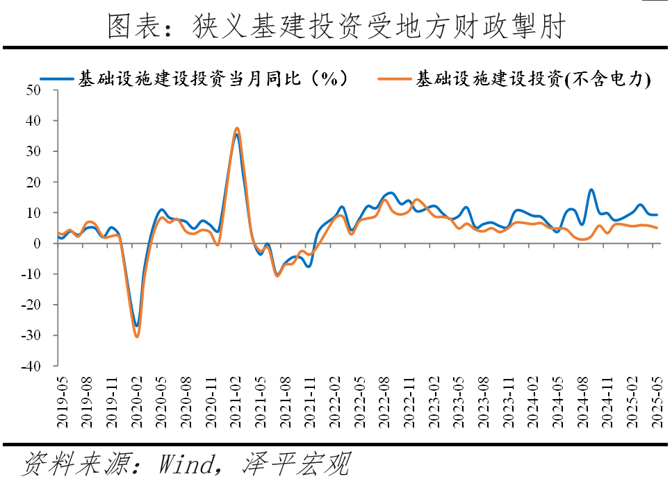 四是即便隐债化解持续推进,地方财政压力仍大,掣肘基建投资,广义基建和狭义基建增速展现较大差距。5月广义基建和狭义基建(不含电力)同比分别增长9.3%和5.1%,分别较4月下降0.3和0.7个百分点。