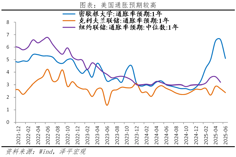 一是,经济层面,美国消费者信心下滑,通胀预期处高位,但消费市场疲软暂时压制企业涨价动力。5月美国消费者信心指数为60.5%。关税使得美国进口成本上升,通胀粘性增强。在关税压力下,食品价格对物价的压力或将进一步显现,CPI分项食品环比0.3%,较上月增加0.3个百分点;密歇根大学1年通胀预期为5.1%。根据美联储研究估计,2025年初关税迄今已使核心商品PCE价格上涨0.33个百分点,导致核心PCE整体上涨0.08个百分点。
