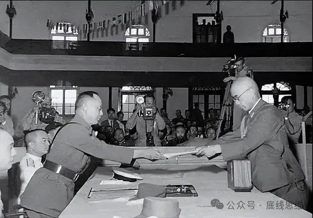 1945年9月9日在南京举行的第二次世界大战中国战区受降仪式,日本中国派遣军参谋长小林浅三郎向中国陆军总司令何应钦呈递《降书》。
