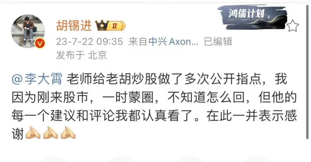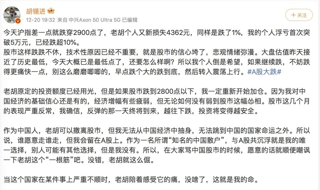 话说的很明白了,股民炒股是为了挣差价,老胡炒股是为了挣流量。只要有流量,其实亏掉的那点股票只是道具,出来表演,道具总是要花钱的。
