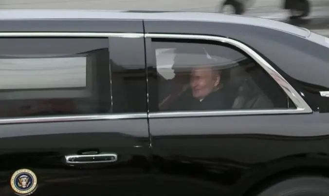 普京下了飞机后,没有坐自己的车,而是接受了特朗普临时邀请,两人一起坐上美国总统专车“野兽”前往会谈地点。