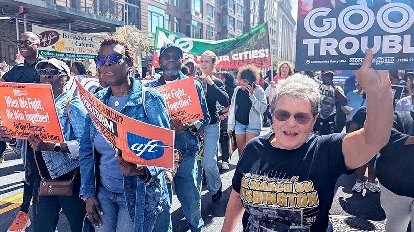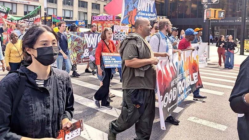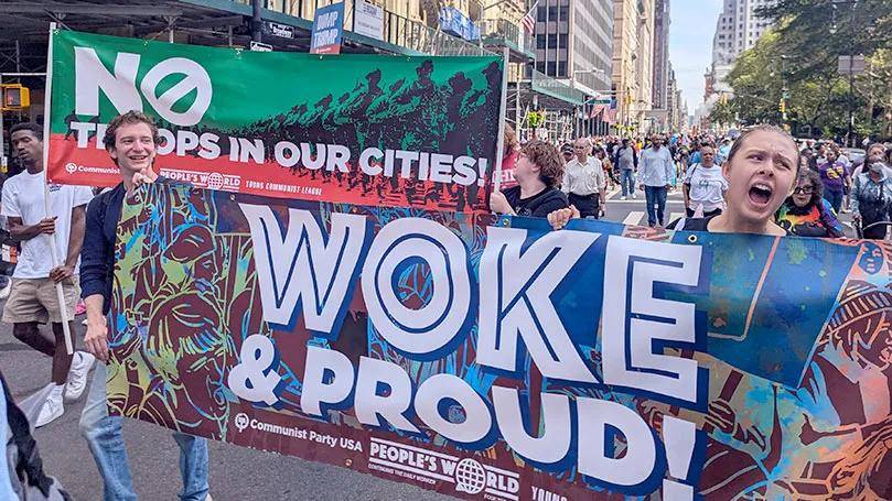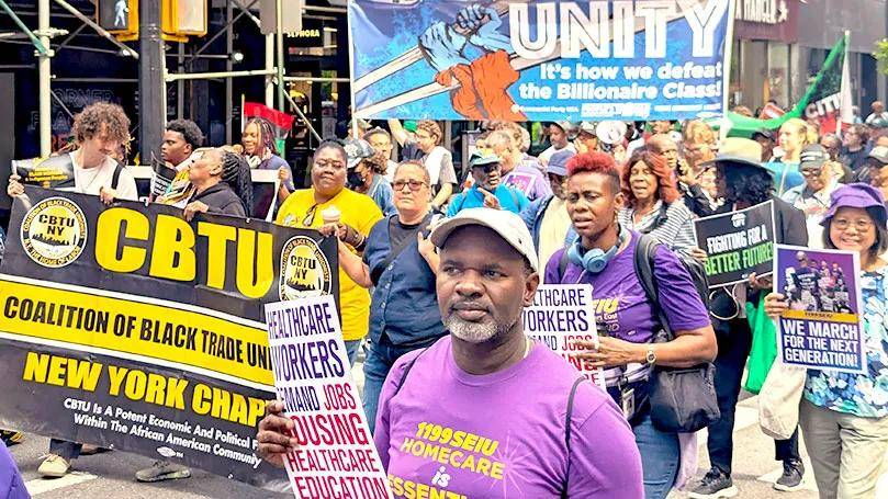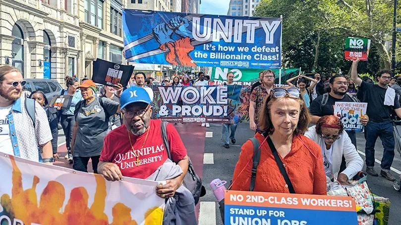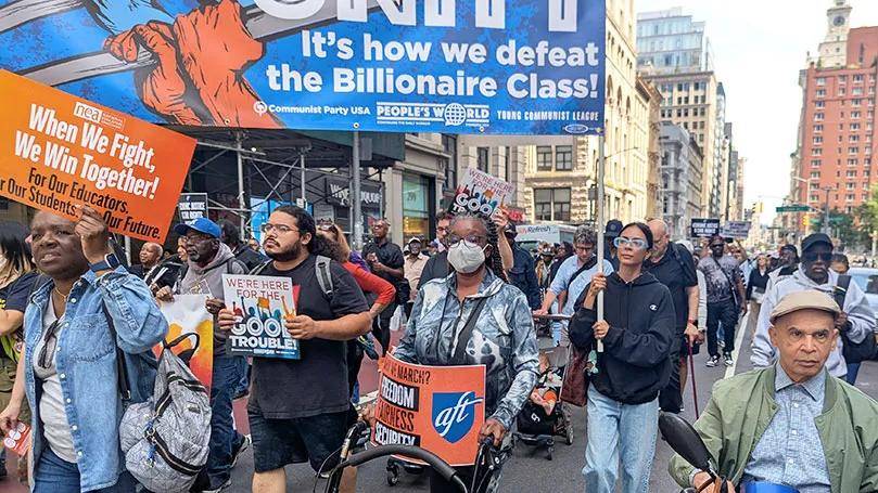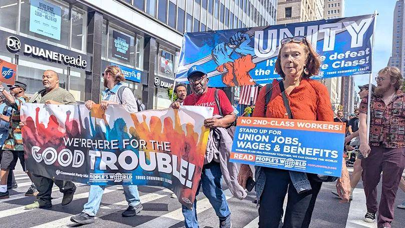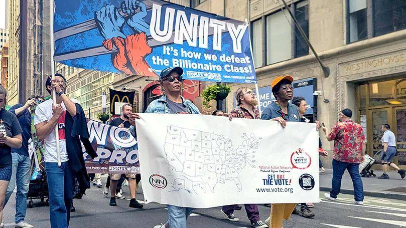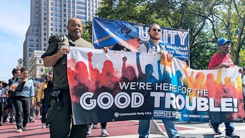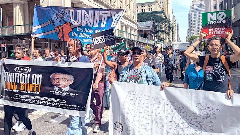 在美国全国行动网络(National Action Network)负责人阿尔·夏普顿牧师(Rev. Al Sharpton)发起的“华尔街大游行”中,美国共产党(CPUSA)成员组成了一支充满活力的队伍,决心与更广泛的工人阶级及民主力量携手,发起“有益的抗争”。