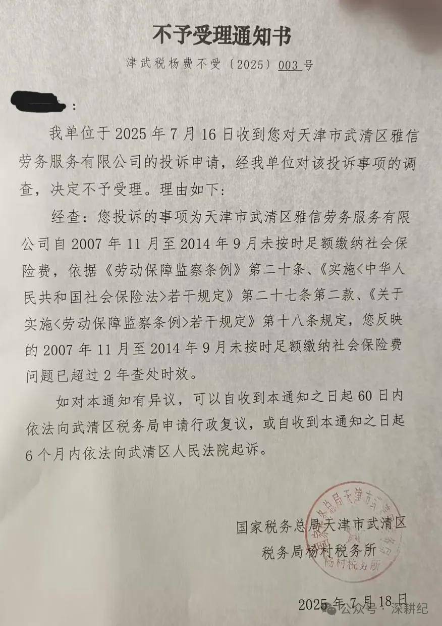 天津打工人老谢,于2025年7月16日到天津国税局某税务所请求追缴天津市某劳务公司自2007年11月至2014年9月未按时足额缴纳社会保险费,某税务所于7月18日出具《不予受理通知书》,不予受理的理由:“依据《劳动保障监察条例》第二十条、《实施〈中华人民共和国社会保险法〉若干规定》第二十七条第二款、《关于实施〈劳动保障监察条例〉若干规定》第十八条规定,您反映的2007年11月至2014年9月未按时足额缴纳社会保险费问题已超过2年查处时效。”