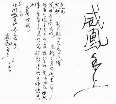 别久颇以为念,遥维阖府康泰为颂!凤将于月内返里一行,约有一周至旬日可留,便望转告小女及晓妹等,多年不见想念你殷,得此可增快慰也!